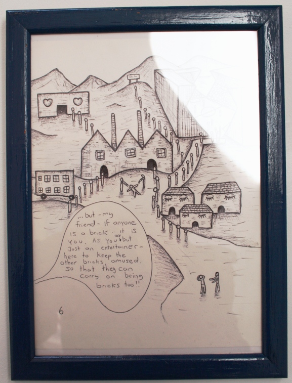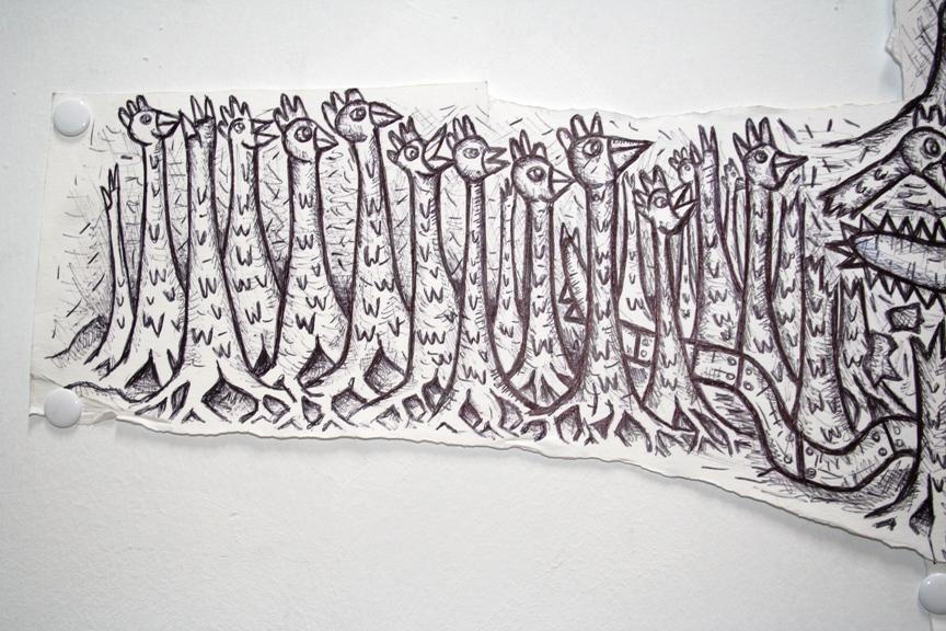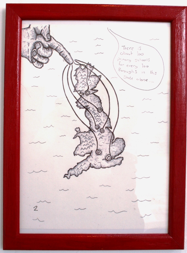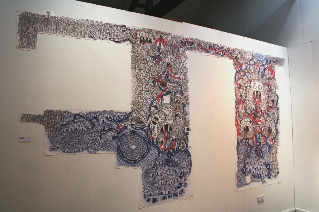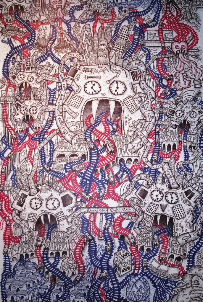 This exhibition is a ‘installationalised’ selection of drawings covering the social landscape; the urbanization and takeover of the natural land and the methods of control over its inhabitants. The centerpiece is The Sprawl, an expansive paper drawing; incorporated around the shape of half of my bedroom (hence the unusual shape) colonizing all workable surfaces in the manner of a expanding city. An expression of a how the city becomes one giant super organism, although separate and hazardous towards Earths working life systems. All the inhabitants, their cars and trains are like the blood running through the veins keeping the city alive.