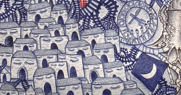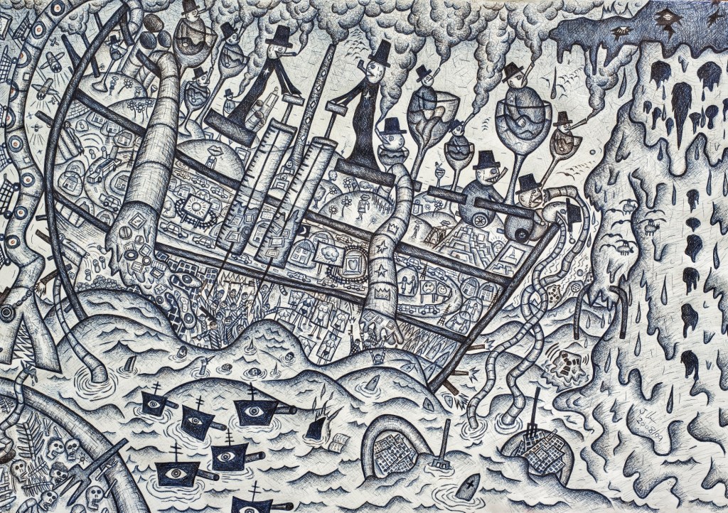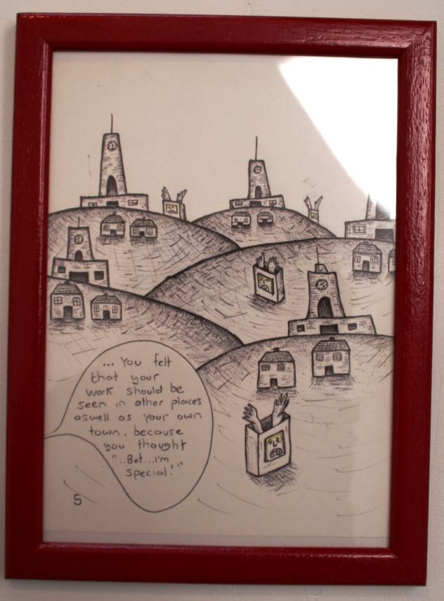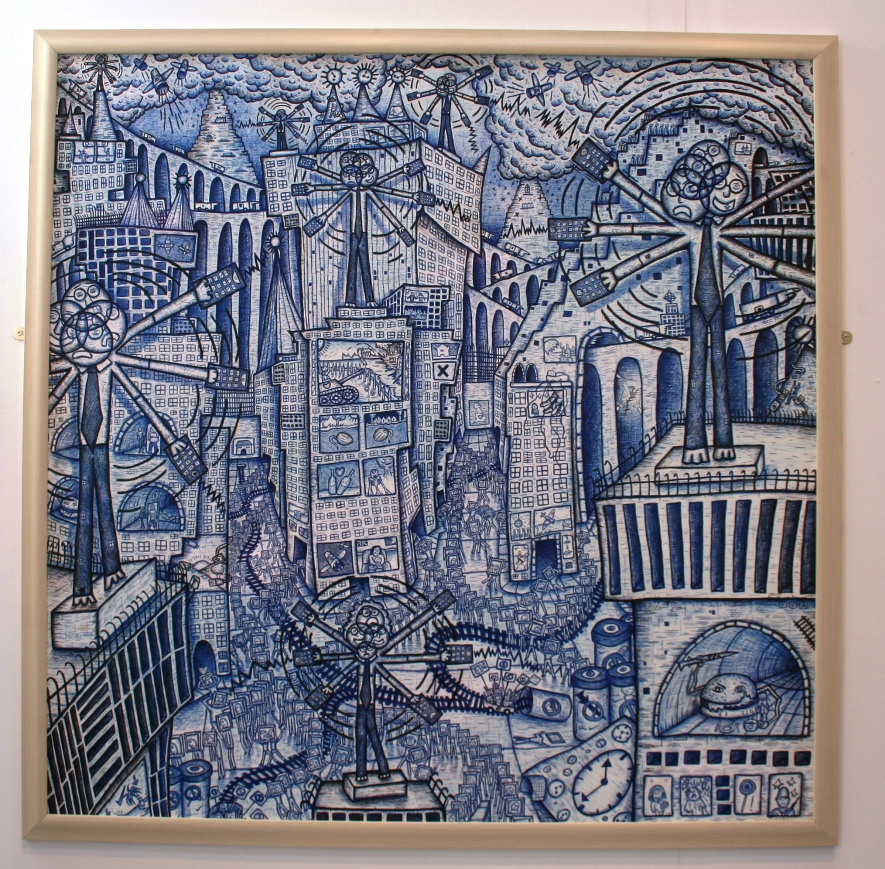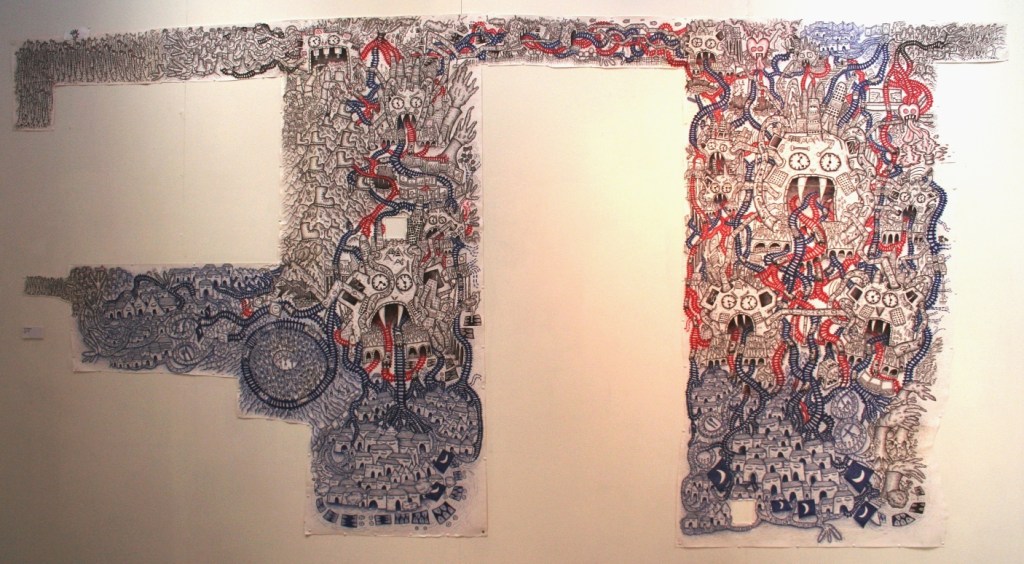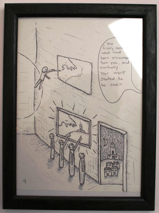 This exhibition is a ‘installationalised’ selection of drawings covering the social landscape; the urbanization and takeover of the natural land and the methods of control over its inhabitants. The centerpiece is The Sprawl, an expansive paper drawing; incorporated around the shape of half of my bedroom (hence the unusual shape) colonizing all workable surfaces in the manner of a expanding city. An expression of a how the city becomes one giant super organism, although separate and hazardous towards Earths working life systems. All the inhabitants, their cars and trains are like the blood running through the veins keeping the city alive.
