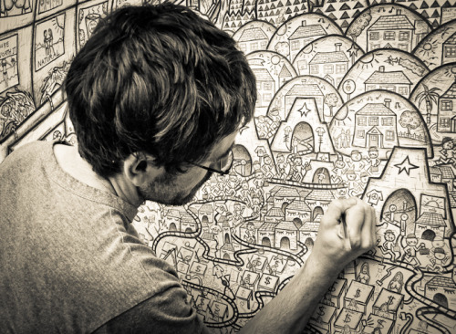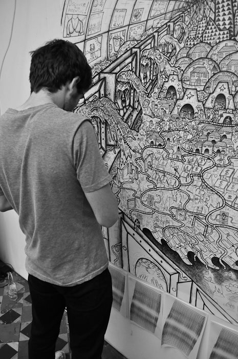 I took part in York this weekend just gone. P A N D E M I C, inspired by the Situationist movement (notably the philosopher Guy Debord, who wrote Society of the Spectacle), invites anybody to come along, to perform, discuss, or whatever they feel they want to do. But it is also an environment of questioning, where preconceived views are challenged – but by everybody, in a none pedagogical environment. It is “a balance between the intellectual and the intuitive: organic evolutionary change via experimentation, deviation and panic is [the aim of P A N D E M I C]”. I was part of the first P A N D E M I C event in Sheffield 2011, and it had a very positive affect on my own, not just artistic, but philosophical/political ideas. I, although my work is usually finished before it is seen by other eyes outside my studio/workplace, have always severely missed the interaction of the days of university, when ones work itself was, by the very nature of being in a place of communication, always evolving organically. Bringing the art I have already been working on to an environment of discussion and other art is always something I see of being of great value. The energy (and even the rhythmical movement of making my drawings) can often feel lost once the piece is finished and up on a gallery wall, where, although it looks how I want it look, can sometimes feel like the dead skin shed by the ideas. Here are some images of my working at P A N D E M I C York on a (still unfinished!) piece called ‘The Planet’s Mental Illness (or) Plantery Mental Breakdown (not decided which title does the job yet – opinions welcome). Images courtesey of Iain at http://iggoire.tumblr.com/