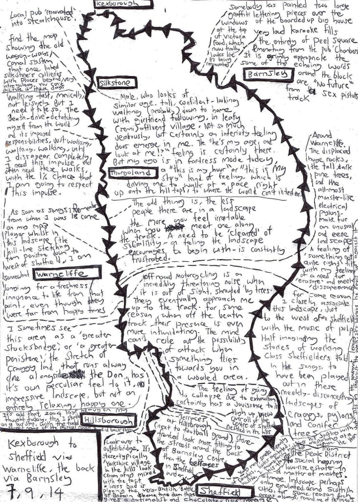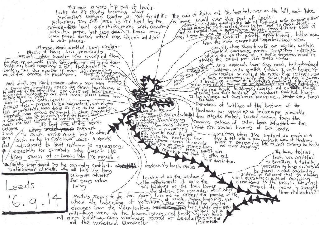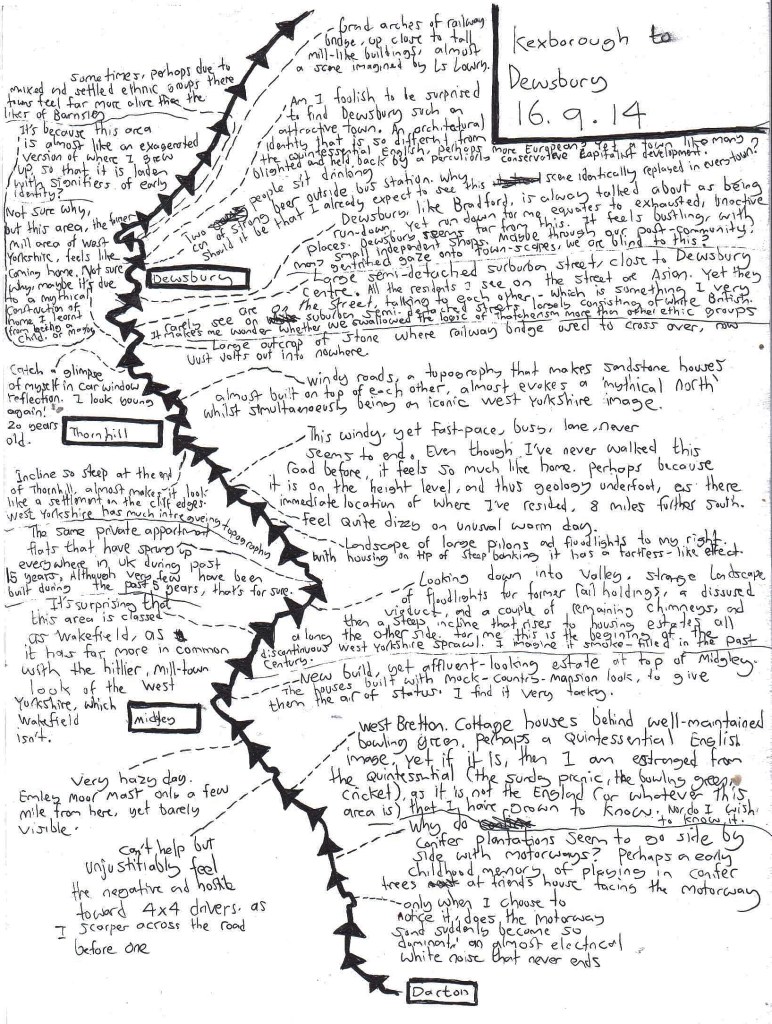 “Not sure why, but this area, the [hilly] former mill area of West Yorkshire, feels like coming home. Maybe it’s due to a mythical construction of home [as in ‘the north’] I learned from being a child. Or maybe it is because this area is [topographically, and settlement-wise] almost like an exaggerated version of where I grew up, so that it [this area] is laden with signifiers of early identity-forming?”