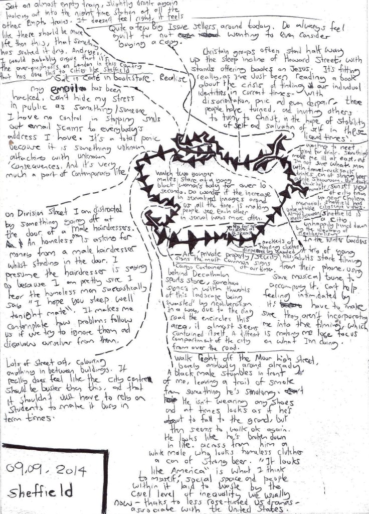 “Walk right, off The Moor high street. Barely anyone around already (at 6pm). A black male stumbles [just] in front of me, leaving a trail of smoke from something he’s smoking. He isn’t wearing any shoes, and at times looks as though he’s about to fall to the ground, but then seems to walk OK again. He looks like he’s broken down in life. Across from him a white male [sat in a doorway] who looks homeless clutches a can of strong beer. “It looks like America” is what I think to myself; a social space and people within it laid to waste by the cruel level of inequality we usually now – thanks to less rose-tinted US dramas – associate with the United States”.
