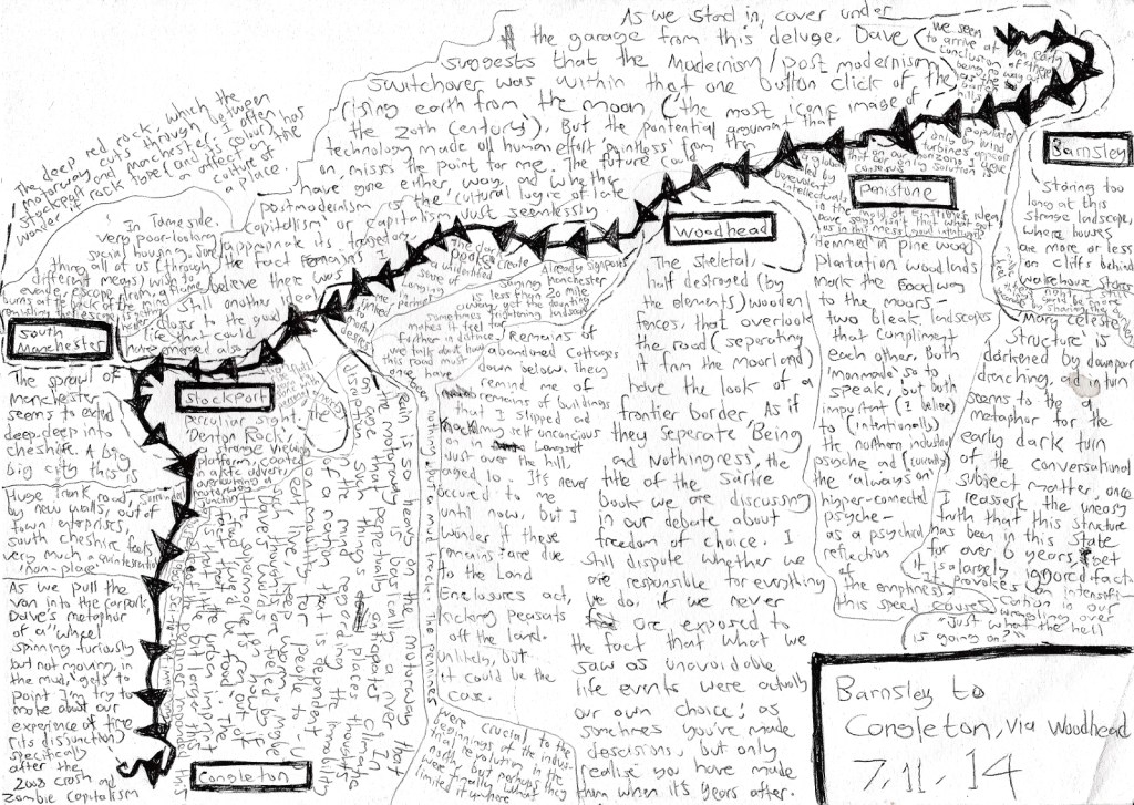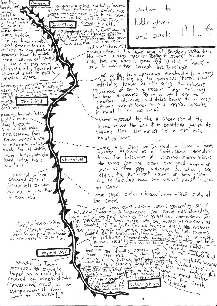 “Large open-cast mining area; [this area is still] generally industrial-looking. A landscape you could mistakenly think was of the past, coming from Yorkshire. Sometimes feels as if Yorkshire has been made into one tourist attraction, as in covering up the truth (as all tourism does); greened over spoil heaps, and severe poverty hidden by lush ravines in Sheffield. As if Derbyshire’s ‘secondary’ position in contrast to Yorkshire’s (increasingly annoying) self-indentit[ification] has kept it more real.”