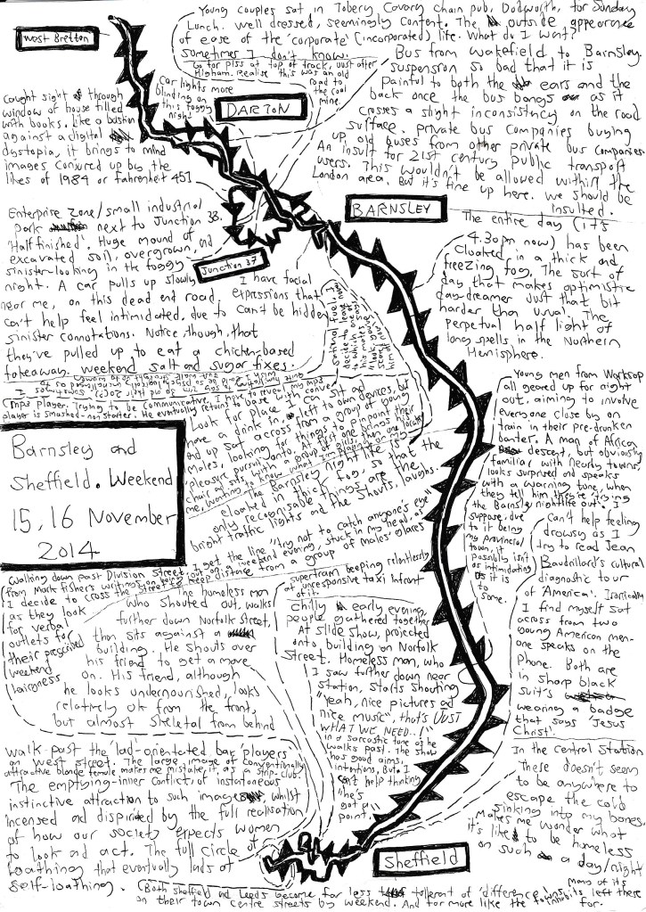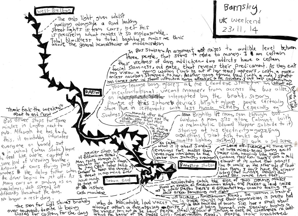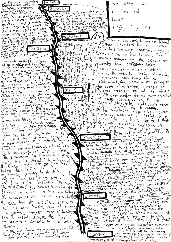 “Just as I’m about to leave the delayed train (at 12:30 am) at Darton, I notice the last remaining passenger, a young man, scrolling his Iphone screen. The moving images on the screen are clearly from sex-room, sex webcam sites. Perhaps the delayed train, alongside its emptiness, have made him ambivalent over privacy. Also, perhaps the anti-stimulating landscape of skeletal transport and life infrastructure of after-dark Northern towns have intensified his dependency on the endless ‘sugary’ stimulation that cyberspace makes always available for the inevitable depressive-pleasure-seeking occupiers of social space-made shit, up here. The fact that this just increases misogyny in real physical space is just the tip of the iceberg.”