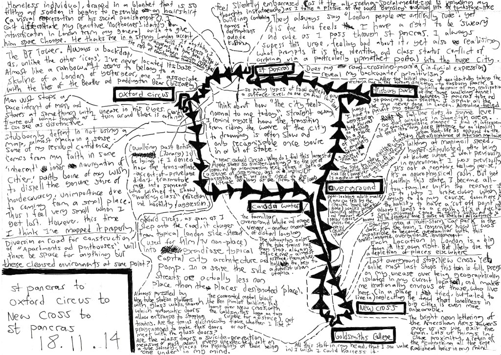 “[At New Cross Gate Station] Talking at maniacal speed. Hyper-stimulated after being at a lecture where I went to study [once], in an environment I was in previously. It’s not a negative feeling, it’s a neuro-physical rush. Yet within this state I become all-too-familiar with the reasons as to why I broke down when I tried to do my course here: the inability to have a ‘cut off point’ always leads to a crash. It’s a fact I can’t always come to terms with, and I know I’ll be depressed [later on] once I arrive on the ‘skeletal’ rail network of the north.”