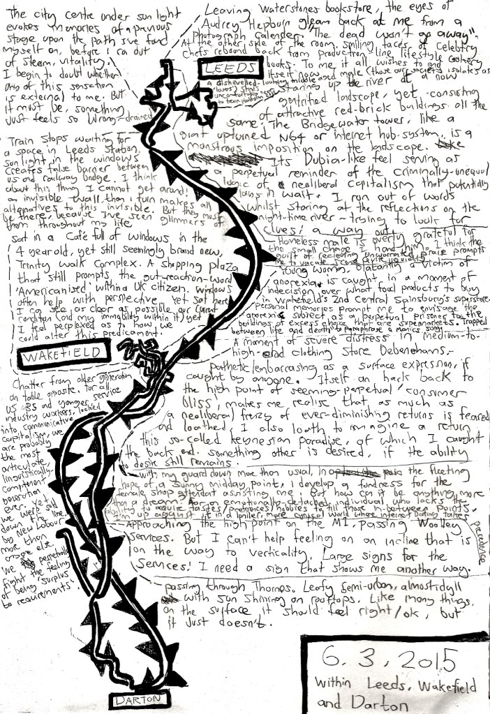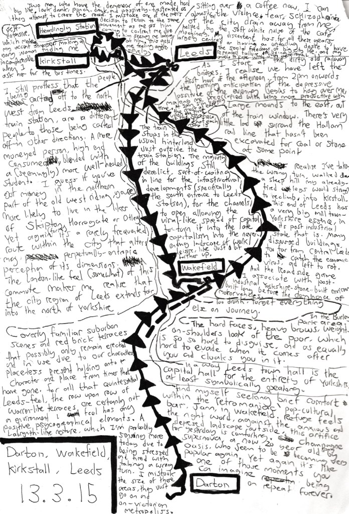 “The train stops in the usual hinterland just outside Leeds railways station. The majority of the buildings still derelict, sort of waiting in line for the infrastructural developments (especially the southern entrance into Leeds station); for the channels that allow the flow of ‘sparkling financial dust’ to spread virally, and turn it into the late capitalist blend of unending work-consumption, that greets you just north of the river Aire. As I stare at the dirty old railways bridges I realise we have left behind the first hour of the afternoon. From 2pm onwards the looming anticipation of the evening’s depressive lassitude hangs over ever thought/action. The 1pm hour is usually the one I find easiest out of all 24, upon the pivot of the see-saw that each day is.”