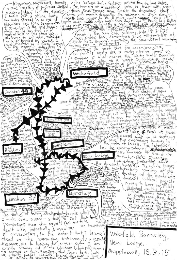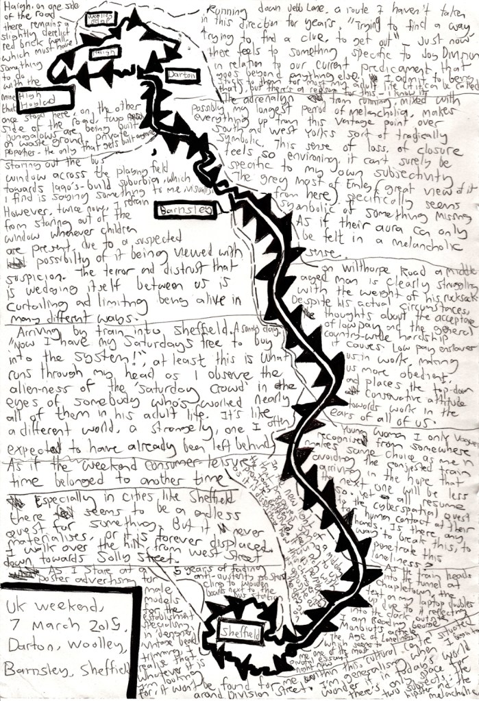 “The feeling of being stuck. That – despite what I know, think, see – I feel embedded in a rut that surely encompasses more than myself (yet is left to be dealt with individually). It envelopes all conversation to the extent that I become fixed on the surrounding environment, which when I think about it makes sense; due to looking for ways out. I am currently staring out the windows of the Glasshouse chain pub/eatery, over the terraces the cluster around the south of Barnsley centre. From here. they look like a tightly-packed labyrinth, forcing your eyes to look for exits. the conversation follows suit, and sometimes the landscape helps me think about, and explain the wider predicament so clearly – but it never alters the [my] general scheme of things.”