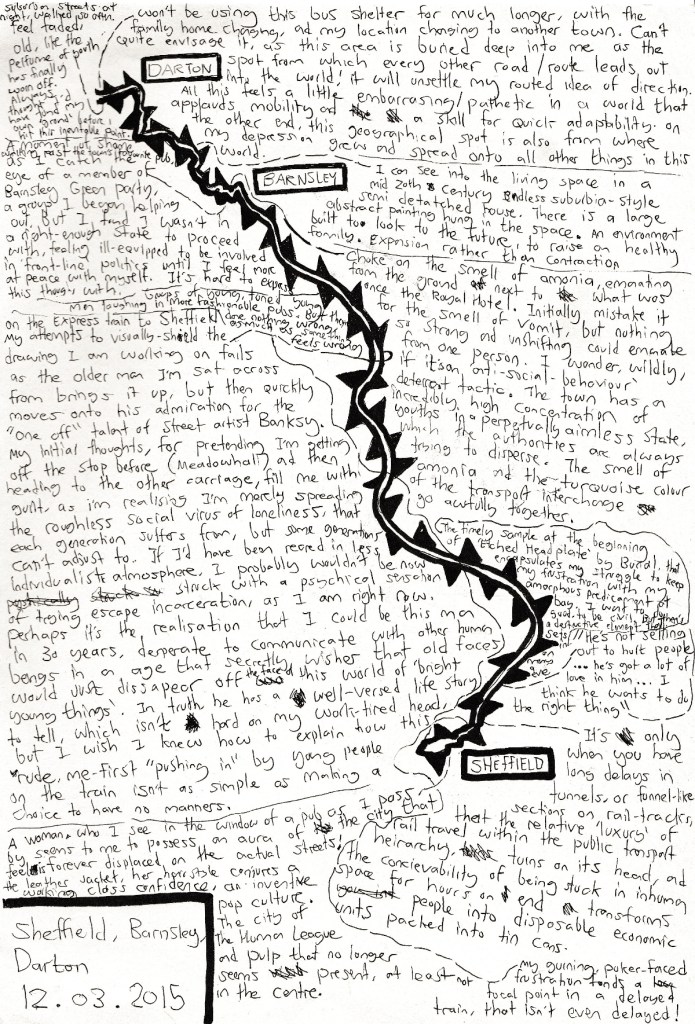 “On the express train to Sheffield. My attempts to hide the drawing I’m working on from the gaze of other passengers fails as a man who I’m sat across from, who looks to be in his 60’s, brings it up in an unending-paragraphs way of speaking, that quickly moves over to his admiration for the “one off” talent of street artist Banksy. My initial thoughts about pretending to exit the train a stop prematurely (at Meadowhall) and then sneaking to the other carriage fills me with guilt, as I’d just be spreading this ruthless (anti)social virus of loneliness, that each generation suffers from, but some just can’t adjust to. If I’d have been reared in a less individualistic atmosphere, I probably now wouldn’t feel physically seized with the urge to try to escape what feels like incarceration (communication). Perhaps it’s also the realisation that in 30 years I could be this man, socially-stranded, and desperate to speak to other human beings in an age that secretly wishes that old faces would just disappear and stopping getting in the way of the ‘bright young things’. In truth he has a decent well-verse life story which isn’t too hard on my work-tired brain.”
