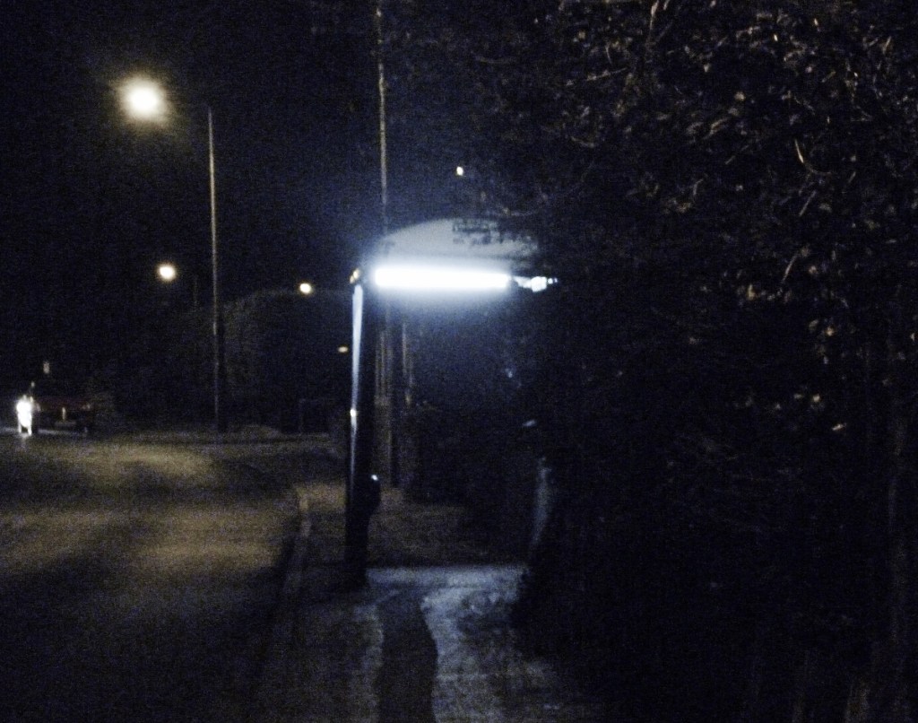 “Drained-tired, I decide to stop walking when seeing a young woman at a bus stop makes me trust in frequent buses back to the centre. As I wait, 2 men who have the appearance of one made hard by life, look drunk, punch-drunk and passively-frustrated as they attempt the road. I mistake one of the mens’ decision to return back to the pavement I’m on as him coming up to confront me due to him seeing me looking at him. Despite this not being the case, this gets me feeling aggressively self-defensive. My accent hardens due to this, making the young woman find me undecipherable when I ask her about the next bus.”
