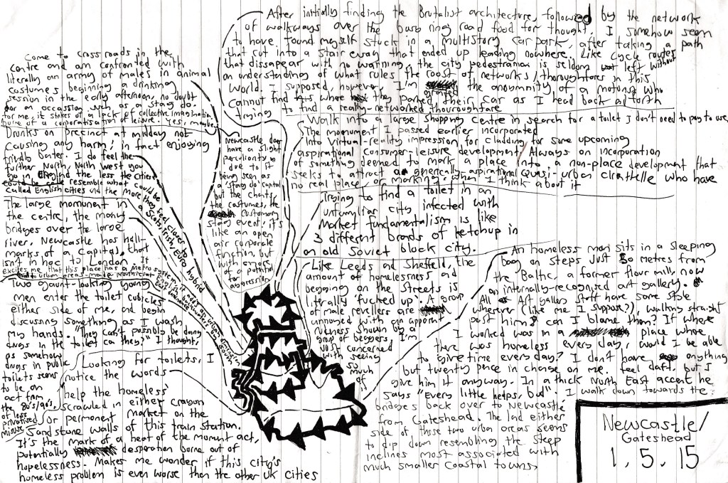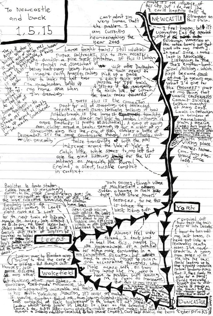 “Looking over to the Beeston area [Leeds]. Always trying to find the core of place. But they’re just houses, or spaces in shops or pubs. Just space occupied like anywhere else. Get thinking about Paul Sykes, a Barnsley “self-made” millionaire, who is now apparently lonely and miserable in his North Yorkshire mansion. It’s never at anywhere if you’re empty. Behind me two ‘bright young thing’ males exchange information of their culturally-exciting, upwardly mobile ‘where it’s at’ lives, spent between London and Leeds. Do I feel on the defensive? I course I fucking do. 6.3ft BBC-cum-highended-student accented males, who look right through a 5.7ft, suddenly-indelibly-localized denizen (myself). Judgmental or not, I can’t help thinking ‘cyberpricks’.”