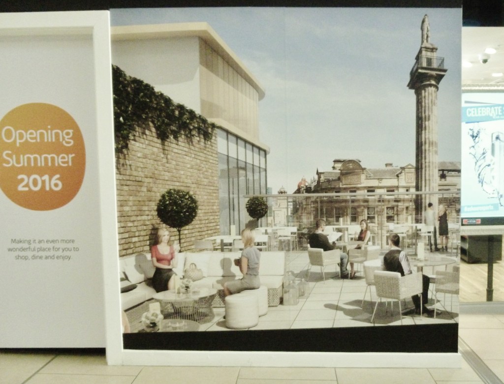 “Walk into a large city-based shopping centre [Newcastle centre] in search of a toilet that I don’t have to pay to use. The big monument I passed earlier appears again, this time appropriated into a virtual-impression draped on cladding for some upcoming aspirational consumer/leisure complex. Always an incorporation of something deemed of place and character into a non-place development that seeks to attract a generic-yet-culturally-powerful aspirational quasi-intellectual clientele, who, themselves, have no real place or character to them, when I think about it.”
