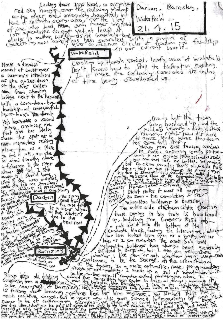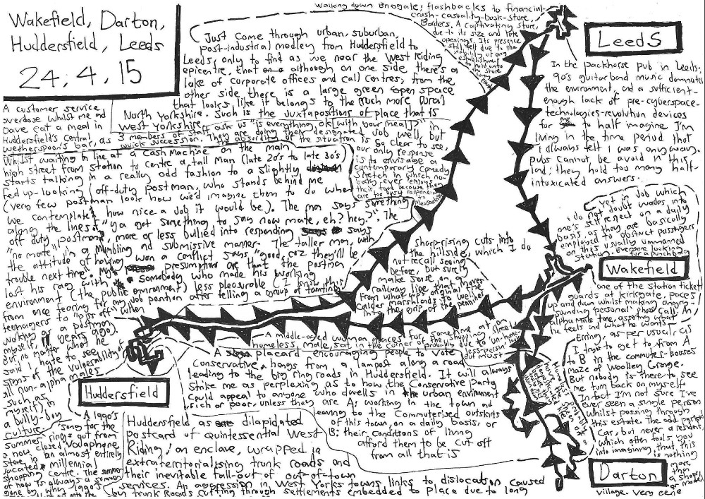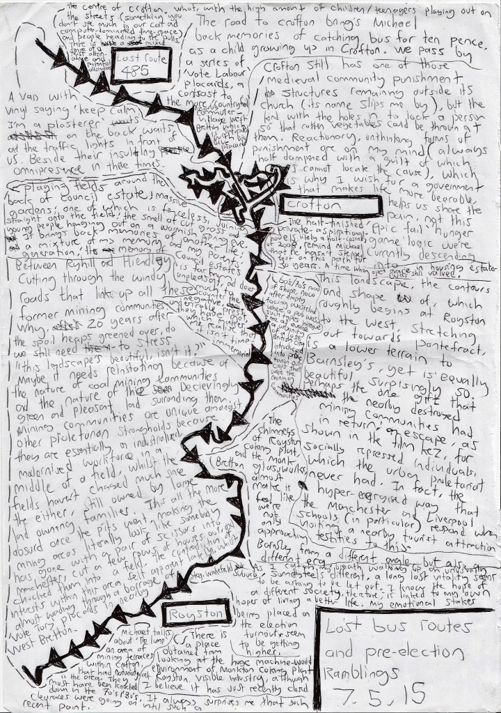 Stories From Forgotten Space builds on 2014 Mapmaking with the aim of taking the most prominent features of the project a little further. It is fact and fiction, clear analysis and emotional garbage, destructive and constructive thinking, but what it is is my truth, recollected through maps made of journeys I make. This section of Stories From Forgotten Space uses lost bus routes and thoughts prior to the UK general election to use spaces to look at what has half-vanished, and what I long for coming into being. Using mapmaking to discuss the fabric of contemporary life may not be ‘everybody’s cup of tea’ (as if that is what everything needs to boil down to?!), but I have always had a love for maps and their potential.