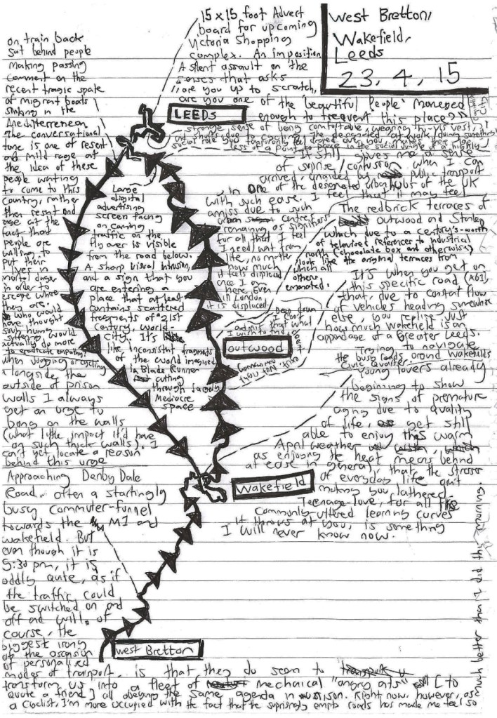 “It still manages to surprise/confuse me when I can arrive, unaided by public transport into one of the designated urban hubs [central Leeds] of the UK with such ease [having cycled here]. I wonder whether it may feel amiss with my preconceived, due to urban centres still remaining as signifiers for all that I feel I want, and need, in life, no matter how much this sense gets displaced like particles scattering once I am in these spaces. This sense of displacement feels especially acute after a long day in London. Deep down I can’t admit that what I am looking for doesn’t exist; at least not in way I keep on imagining it, nor in constraints of our current social reality.”