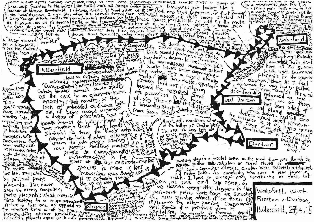 “Travelling through a wooded area that runs through the neither suburban-nor-rural mill-town-cum-commuter-village clusters, Clayton West, Scissett, Denby Dale and Kitchenroyd. As somebody who goes out running a few times a week I have to accept my complicity in this, but me and Dave can’t help but agree, as we observe every jogger, in this post-work period, that they are somewhat the new zombie subject of our times. They have replaced the older passive consumer-mall zombie of a previous stage of capitalism. Financial speed re-channeled as undead-anxiety running through our veins. Driven, yet simultaneously passive. Going through the mechanical motions as if the levers and cogs of the long lost factories merely spilled out onto the streets after their closure.”