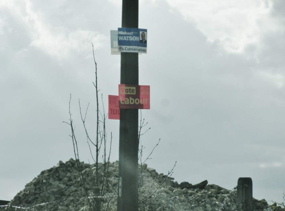“The roads cutting through the fields between Wakefield, Barnsley and Huddersfield are so saturated with ‘Vote Conservative’ placards for the upcoming election, that (A) I feel ashamed of my lowly posture to be walking amongst them, and (B) undeniably relieved to see that one of them has been pulled up and placed face-down. “Not all cap-doffers ’round here!” Whatever the outcome may be come May 8, the moral humiliation of a Tory victory could prove too much to bear.”