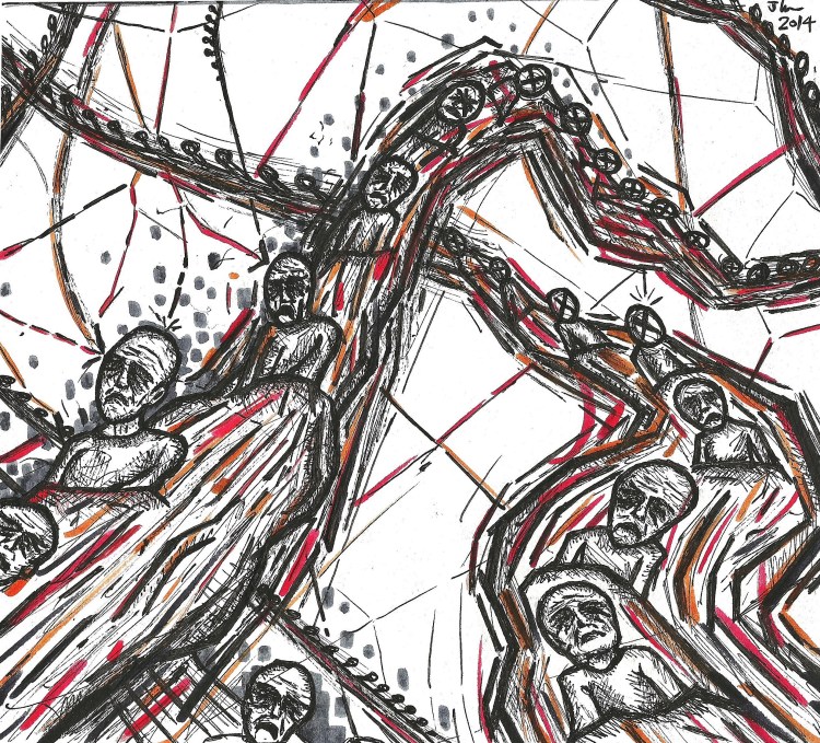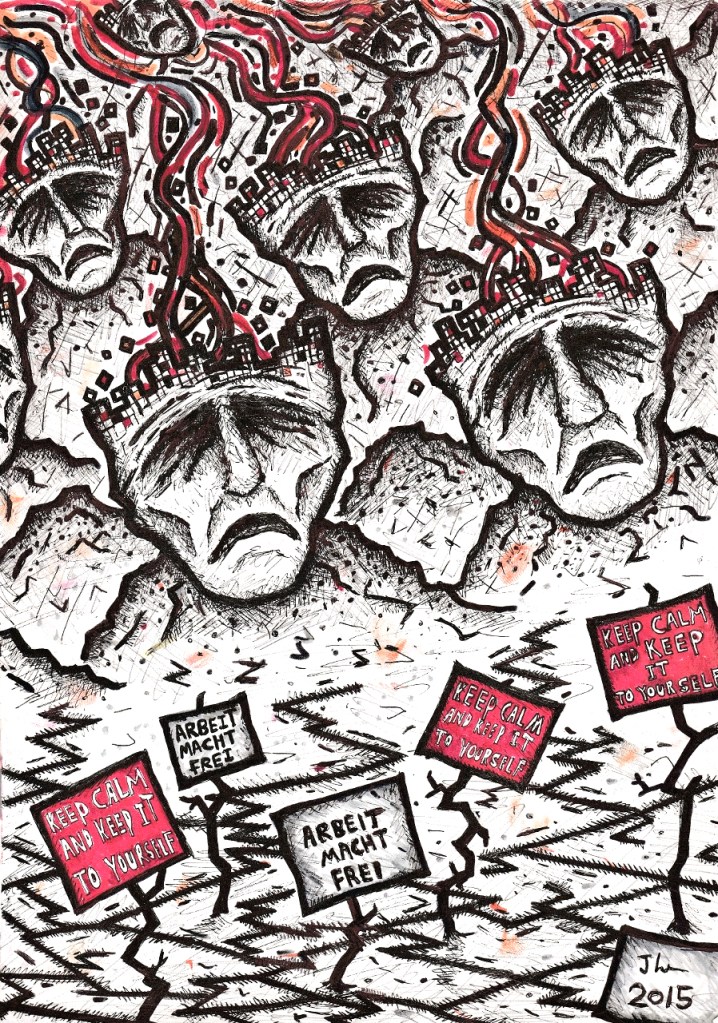 I will be showing my more smallish drawings ‘Hyper-Malaise’, ‘A Cognitive Austerity’ and ‘Five MORE Years…’ in ‘Bells From The Deep’ at The Hundred Years gallery, Pearson Street, Hoxton, London, E2 8JD.