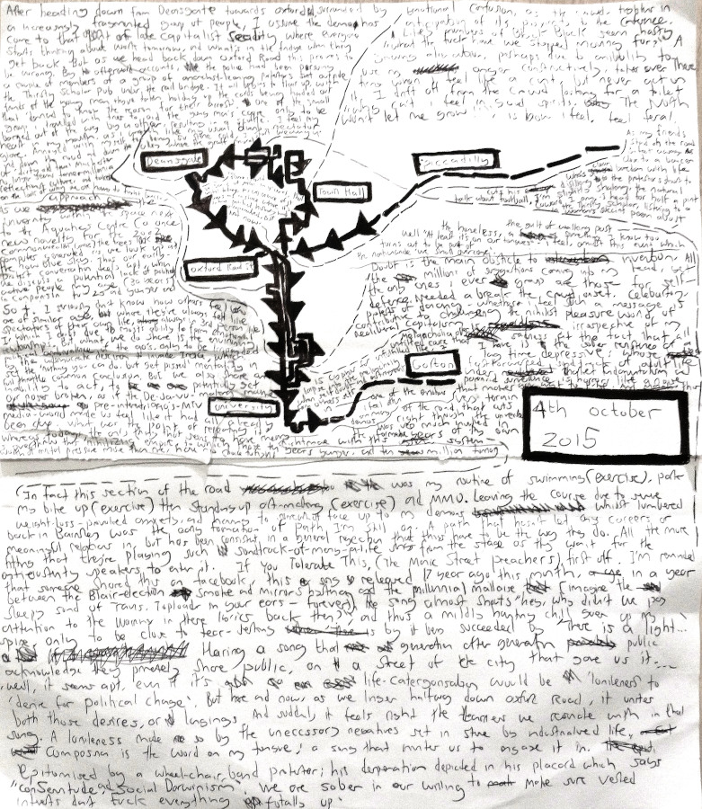 “I move in and out of the crowd, to the toilet and to find [expensive bottled] water, and back onto Oxford Road – the crowd density distorts my perceptions to make me think I am walking far further away. I get Flashbacks to my time here after now standing on this section of road for over two hours, as if the duration of my presence is helping me absorb my old haunts. As I reflect on my inability to act, I realise that doubt is the main obstacle to invention and intervention, and I’m plagued by way too much of it. And all I usually find I can resort to is the sober resistance of a long-time depressive. I think of my life since I came to this place aged 19, and it conjures a soundtrack that is one constant noise….and it makes me nauseous. Leaving that course due to severe weight loss-provoked-anxiety/dysfunction meant I had to go back and face certain demons I’d been literally running, cycling [and swimming – at the Aquatics centre!] away from. This forced out the beginnings of my political awareness and the beginnings of being on the road I am still on. Even if that road now feels blocked.”