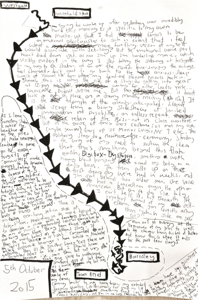 “Michael picks me up early on and we head over to Ossett, a small town sandwiched between Wakefield and Dewsbury; a ligament in the West Yorks conurbation of towns. On the car radio a program speaks of French Electronica, such as the likes of Air – of whom a sample is played. A warm, lush sound. “Why don’t I listen to this more often?” I think to myself, knowing full well I won’t, as something of my reality cancels it out; the warm sunny glow it evokes is squeezed out between the fear and disbelief of these hyper-connected and hyper-competitive times. We pick up Tony and Michael’s partner (both of whom I cannot remember if I’ve met before), and I have a moment of open embarrassment and inner concern over the utter absence of any memory of meeting Michael’s partner at an event almost exactly 2 years ago, as we drop down the hill that brings you to Dewsbury (an attractive town that always surprises you for being so, due its unjustified negative press in the shadow of the Leeds/Harrogate/Ilkley perception of what is good/nice), . I haven’t felt there to be any duration to time or continuity to its passing during the past few years, to the extent that nothing seems to stick anymore – not like it used to. Further more, if this is a common complaint from the elderly who suffer memory loss, could this suggest that something of contemporary life could be bringing about an epidemic of ‘premature’ Alzheimers? – cold stabs of terror that aren’t appropriate to bring into the conversation right now. But any life so uneventful that nothing sticks, and nothing registers until death, isn’t a life worth living, and this is actually one of the reasons contributing to the utmost emphasis I began to place on partaking in political demonstrations in the wake of the May 8 election results. The sun shines on the now-sandblasted yellow sandstone that Dewsbury is built from. It doesn’t look so dissimilar from my home town, Barnsley, which stands alone in Yorks for being a former mining town that looks more like a former mill town.”