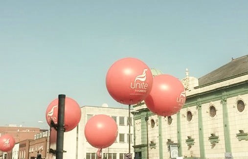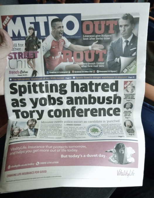 “As we wait for our delayed connection in Dewsbury station, two Manchester Airport-bound trains race past at a pace that can’t help impress in a way that an ever-quicker broadband connection can never. Trains used by TransPennine Express franchise trains aren’t the world’s fastest, but in relation to the still-slightly-slower pace of Sunday life, they are like horizontal space rockets, that force our primitive responses to watch them off into the distance towards the Pennines. As our train approaches we see the Sardine Can-scenario usually reserved for the weekday peak-time commutes. It’s heaving, and the member of staff on the train’s tannoy apologises for this in a tone that may as well have openly spoke of the inadequacy of privatised rail services for not putting on extra carriages. He could probably judge the spirit on board this train, as the majority of the passengers were clearly on course for the anti-Tory demo over in Manchester, and a general good air quelled any of our felt-grievances about being crammed into the wobbly section between the two carriages. With people from the Newcastle, Middlesborough, Leeds Metro areas all piled upon this train, there’s a feeling that The North can show London that not all big demos have to gravitate to the capital. My lack of window views means I’m missing out on my felt-need to see the Pennines as they rise up to separate Yorkshire from the blueprint for modernity – the sprawl of Manchester. However, I find great encouragement in that a man is walking around handing out free copies of the left-wing paper The Morning Star; such a refreshing gesture in comparison to the UK’s usual commuter misery-staple The Metro, which somehow still manages to present itself as not being a right wing rag.”