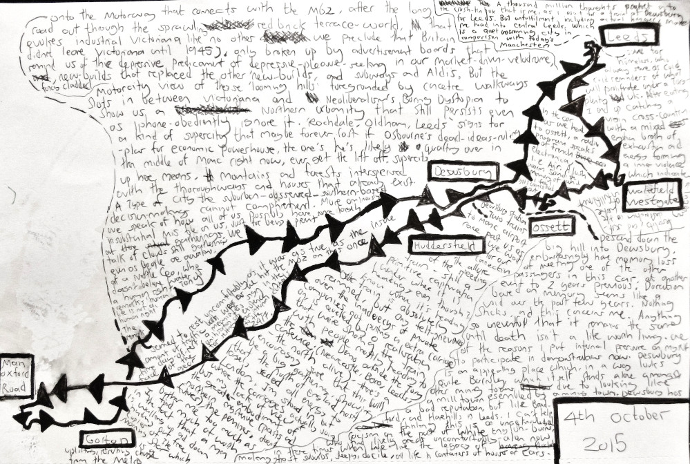 “Our friend James, who met up with us towards the end of our time in Manchester today, takes us home in his car, parked on a side-street halfway down Oxford Road. As we exit via the Gorton area of the city, through the mixture of the very-manchester-like red brick terraces, the nowhere place Tesco extras/ Subway sandwich establishments, and drunks stumbling home from Sunday drinking, that seem to constitute the entirety of East Manchester, it all leaves me under an ominous cloud of confusion as to where we go from this point onwards, in the future, and today – as personally speaking, what do you make of the remaining waking hours after such a bombardment of thought and feeling? How do you deal with it, so as to function the day after? As we link up to the motorway system, The conversation leads back to the actions of the police in the city, and focuses in on mild-terror-provoking potential future predicaments in a more extreme, less tolerant world, where state power goes to extreme lengths to stay control. All the more barren does such talk feel due to traveling amidst the overlooked and sinister-beauty of this landscape made up of motorway bridges as they twist and rise in front of the martian-like Pennine terrain, that feels like an unwelcoming ideal setting for the bleak future projections all-so-poorly hidden behind our conversation of tired banter. I decide I can’t go home just yet, and as we pass over into West Yorkshire I ask to be dropped at Dewsbury station, (I mean, we’re going past it, so I may as well) and as the day’s toll on my energy becomes apparent, I exit at Leeds station, almost crawling up to a large Wetherspoons that is scarcely populated in a city that looks deserted in comparison to the one I have just been in.
