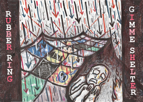 Making art about bands isn’t something I have done since college, so I thought it was due time to take this challenge in a town where music has a bigger place in peoples’ hearts than visual arts. I tried to make a work that looked at how music has been a back bone to my art making life, whilst also looking at music in relation to the experiences of contemporary life that my art deals with. Hence the usage of The Stones’ song title Gimme Shelter (although I am not a huge Stones fan) and the Smiths’ song title Rubber Ring (i.e “The songs that saved your life”). The drawing features a patchwork of both recognisable albums, and albums that have meant a lot to me.