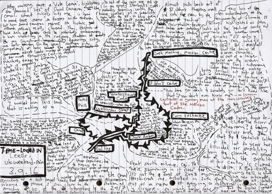As we exit the canal and walk back to the city we talk of how this rain isn’t the tropical rain of a future depicted in the likes of Blade Runner or a Drowned-world-Britain, but rain as the persistence of the past. The intolerable mundanity that ’24/7 ‘ aggravates by pretending it is no longer. After nearly an hour we seek refuge and end up in a Starbucks cafe. Although it is probably teeming with employees from the city’s the financial sector in the week, on this UKweekend day it is utterly empty, and in this sense it’s perhaps the only bit of Leeds-city that has managed to totally successfully mimic a part of a non-place London – any outsider to the ‘Big Smoke (and Mirrors) will be surprised find that ‘The City’ (as in the financial heart) is like a ghost town on a Saturday.”