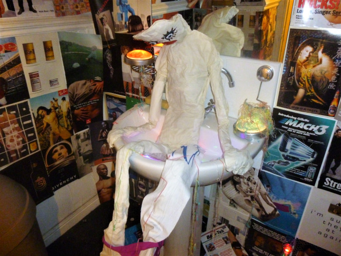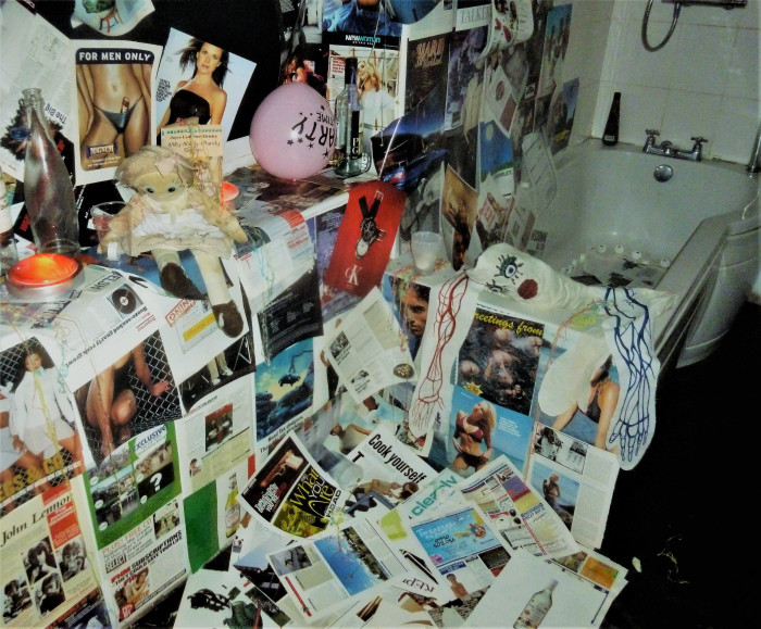 We move on to a room exhibiting many of my most recent drawings, including Hope of The Nihilized, and Dead Ethics Hysteria, only to become aware of disconcerting sounds from a darkened room opposite; a remix of collective member Benjamin Parker’s composition ‘I Thought I Was Awake’. We reach a dead end, with collective member Rebekka Whitlam’s installation ‘Milly-Mollyy-Mandy Gets Loaded and Other Stories’, which ‘looks at a nation’s 21st century come down from 20th century hedonism’ in the bleakest of ways.