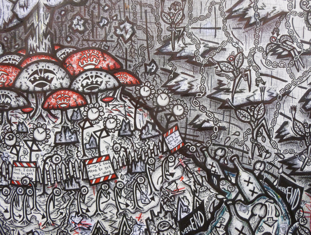 Nonetheless, the current works are trying to take on the concepts of ‘dark optimism’ (which I borrowed some time back for my own uses, from ‘The Transition Towns Handbook’, by Rob Hopkins), and (my own) ‘punch-drunk idealism’, largely by pitting the capabilities we have before us, against the evidential mass mental breakdown that our current hysterical accumulation of modernity is causing. There has become within myself and my work an almost religious conviction that this moment, where we are at a saturation point regarding our ability to care and hope, will cause a tipping point where we will be forced to collectively transcend the ‘soul fracking’ of late-stage capitalism. I say religious to be cautious that I may just be fooling myself, but I guess if I didn’t at least have some belief that the future will be live-able the I’d be a nervous wreck.