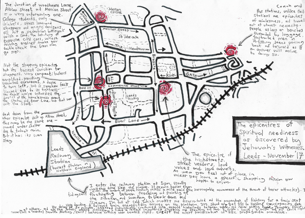 The week before Jan 22 these placards were placed around specific areas in Leeds city centre. I chose the places the Jehovah’s Witnesses usually have their stands on a weekday; speculating that they had located the areas within each city which are the epicentres of spiritual neediness, the places where the most negative emotions prevalent in late capitalist life are felt on the street.