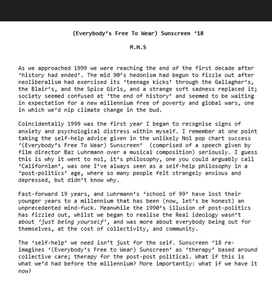 The above flyers were distributed on the night of the exhibition where I exhibited the audio-piece ‘(M.H.S) Sunscreen ’18’, an audio work put together for the project by myself and collective member Benjamin Parker.