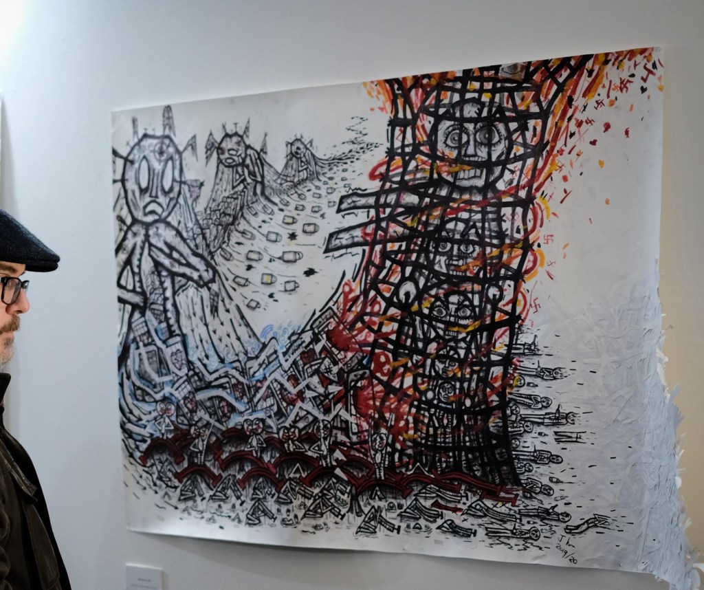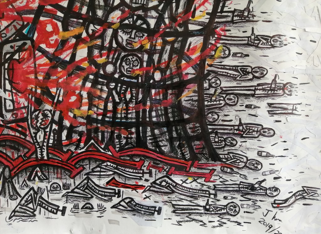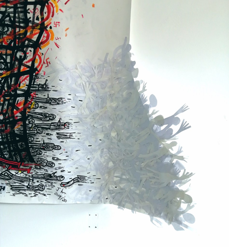 This means that the work that this recent and the first large scale drawing in over 2 years, ‘We want to live’ is not only a full stop and the end of all this work, it is now time to take heed. As the person I currently am, the ego ecosystem it sustains, I have said all I can say. The reason I made my film, which was very much about my own life, was because I realised I had reached a point where I had to move on, change. This exhibition has told me that there is no going back, whatever happens.