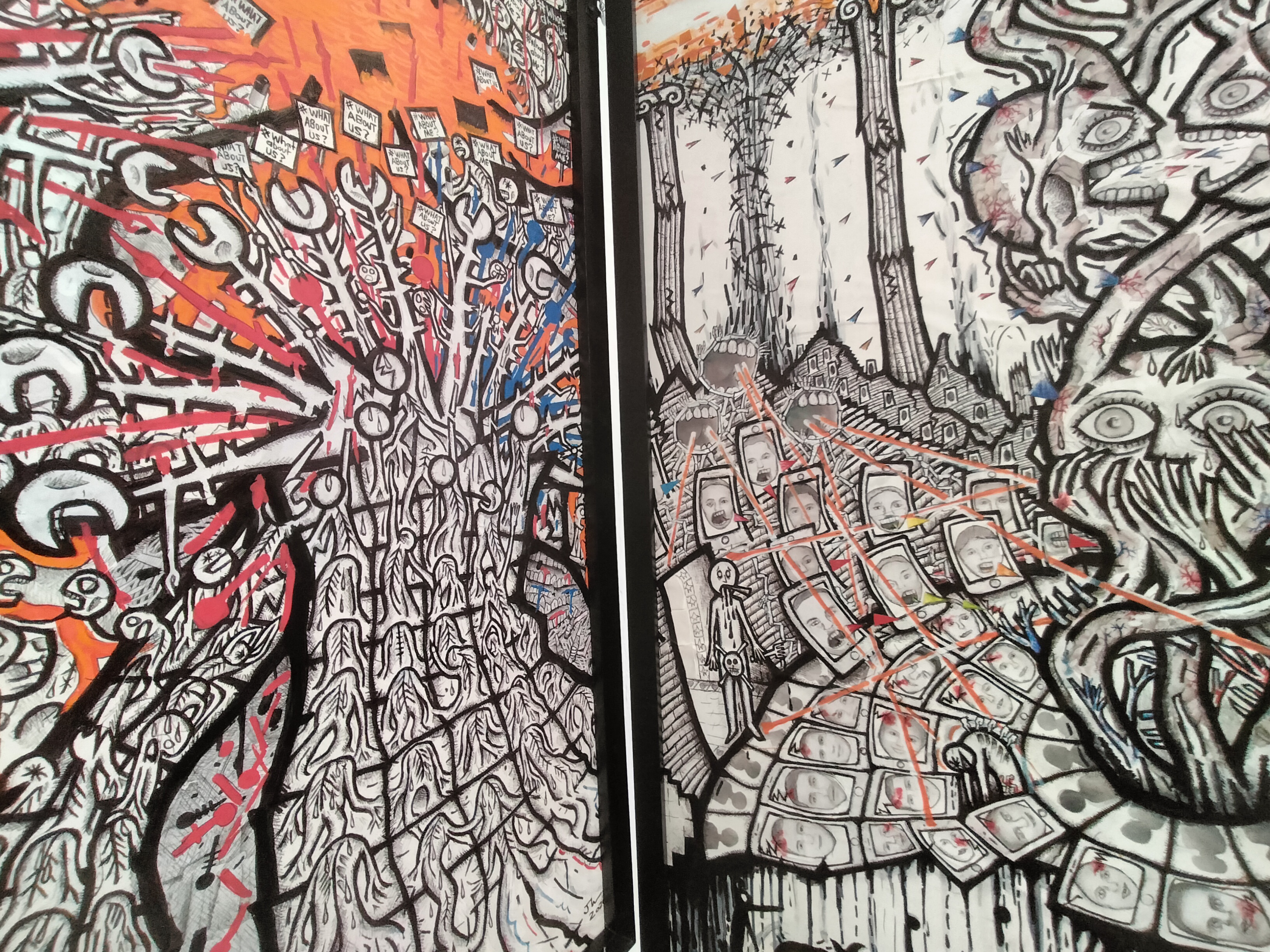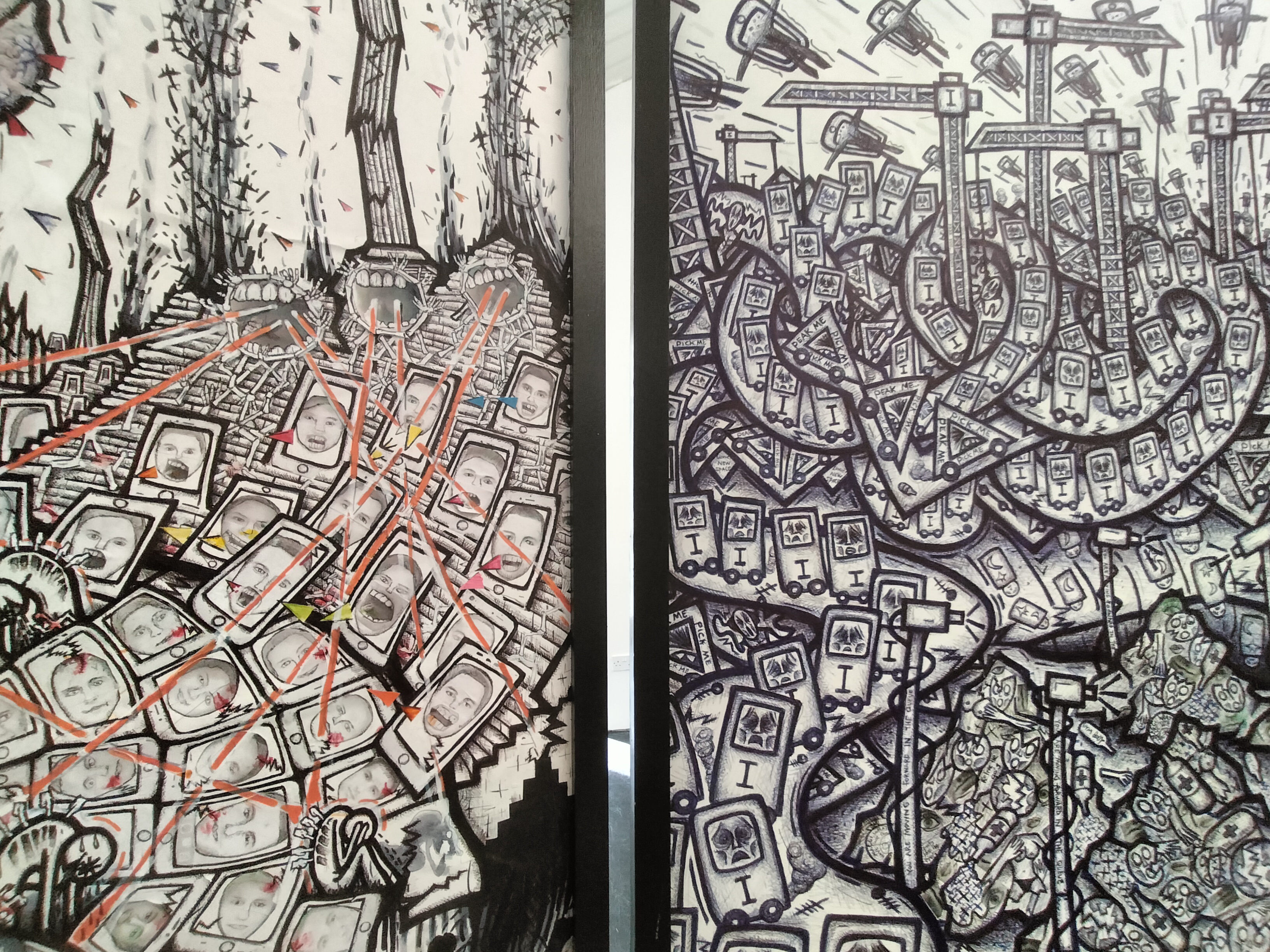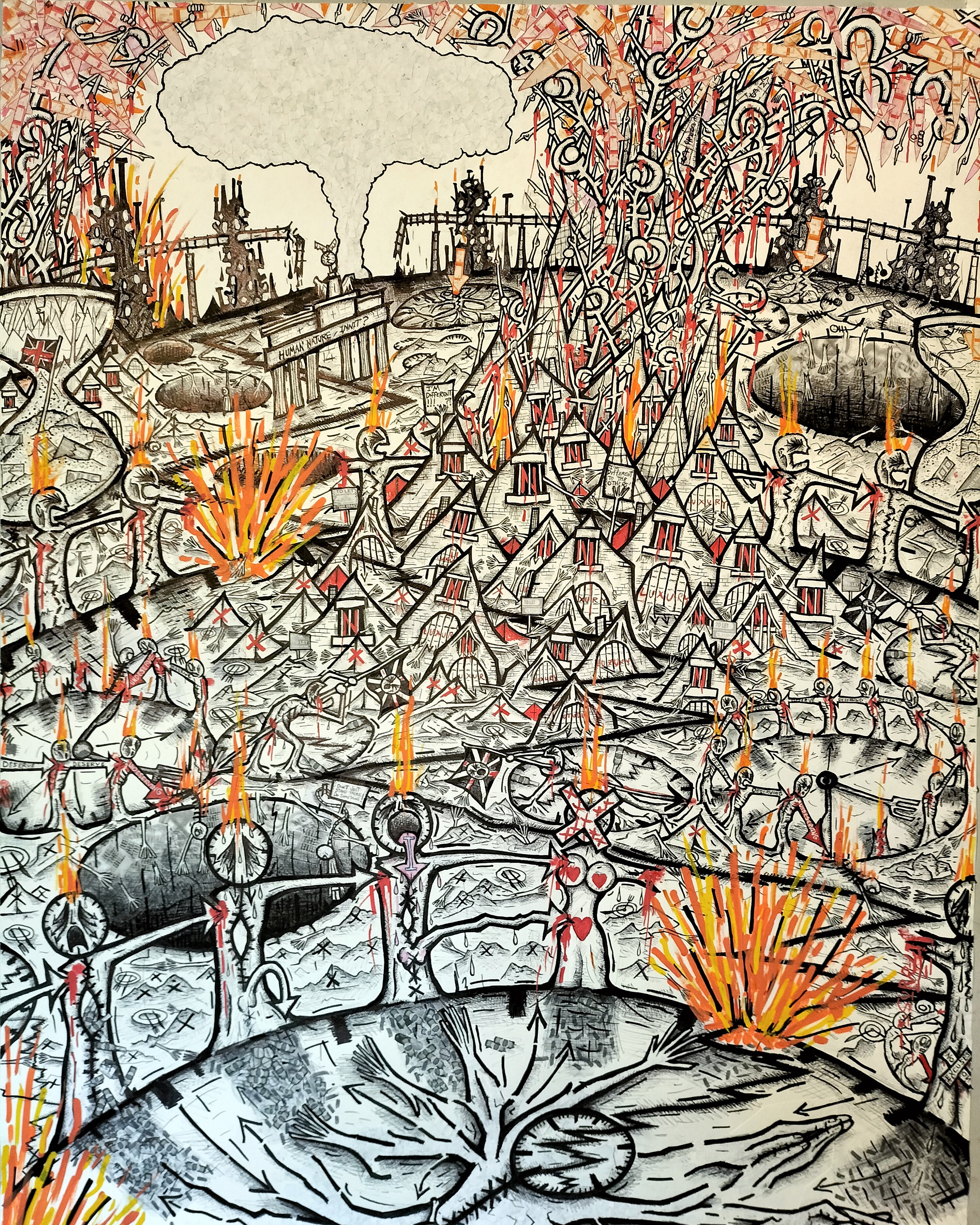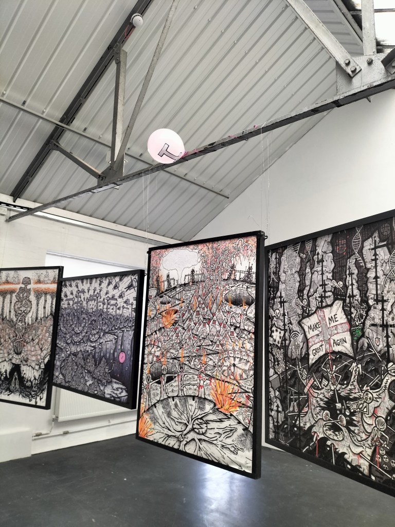 Over almost fifteen years of exhibiting I have been known mostly for the large scale drawings I have created. Initially mainly in biro, and initially formal critiques of capitalism and climate chaos, what I have realised in their development throughout the years is their persistent interrogation of this friction between free will and causality. In my own constant battle to grasp autonomy from the ‘Tides of Society’, the name of my first Sheffield-based exhibition, in 2010.