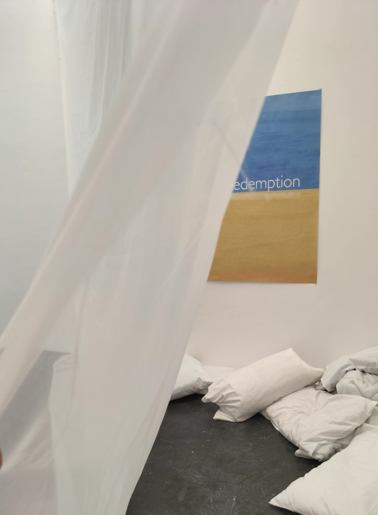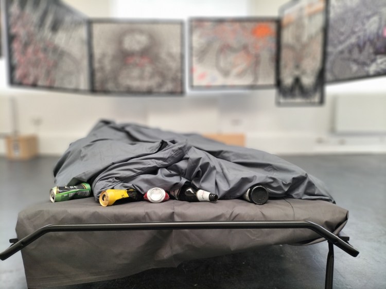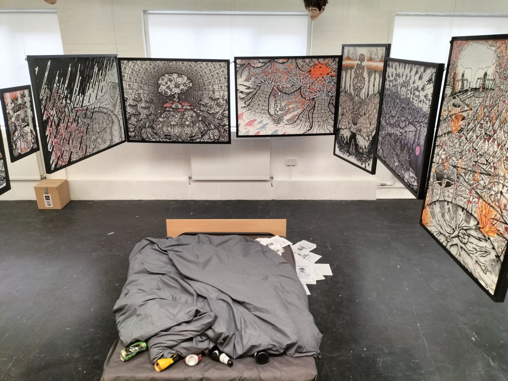 We collectivised a body of drawings into a panopticonal installation, revolving around a quite familiar thing in the art world; an unmade bed. Over the past years, I have not only started to recognise elements of toxic masculinity, carried residually from a cultural different past into a living, breathing present, but I also recognised similarities in my life experiences with what is called Incel Culture (men who “can’t get laid, or get successful jobs, but yet associate themselves with that idea of masculinity, and respond to this by creating a toxic culture of often violent hatred to women and themselves). The unmade bed felt like it was no longer Emin’s but my own, a ‘lived in’ bed for my own mental health in 30’s adult hood, my addictive behaviors disrupting functional life, as my own toxic masculinity rising to the surface, laying into me for “failing” to self actualise, whilst encouraging harmful behaviours to continue.