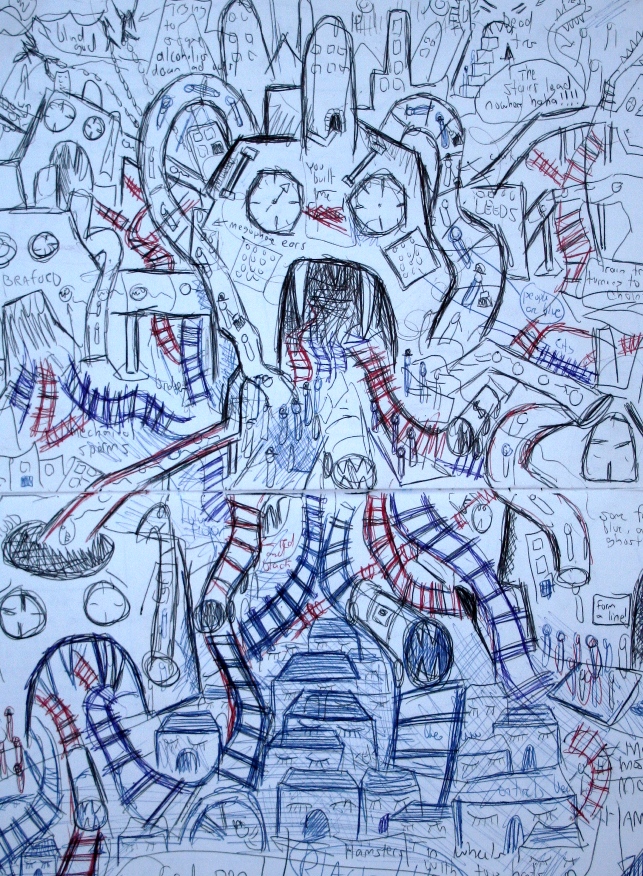 The original sketch (3rd drawing along) was equally as memorable. Caffeine rush on the train home from Leeds (the composition is definitely Leeds-inspired), and just started scribbling down the composition in a manic manner that I would feel probably feel embarrassed to express in public now.