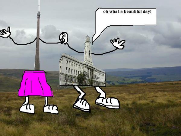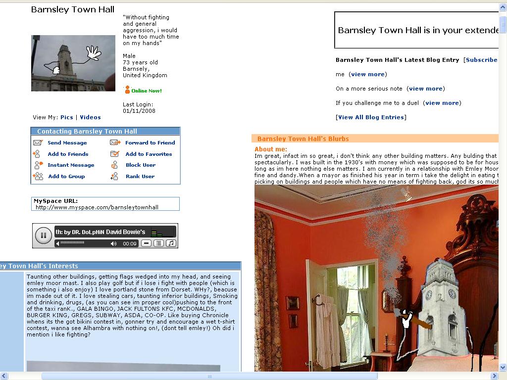 I, on the other hand created Myspace profiles for both Barnsley town hall (male) and Emley Moor mast (female) who were in a ‘complicated’ relationship with each other.