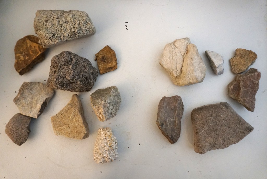 The image above show two sets of stones. On the left are stones collected on the Dark Peak, whilst on the right are stones from the Westmoreland North Pennines. All are from the Carboniferous era, with the exception of a few older rocks to be found from Igneous outcrops in the latter.