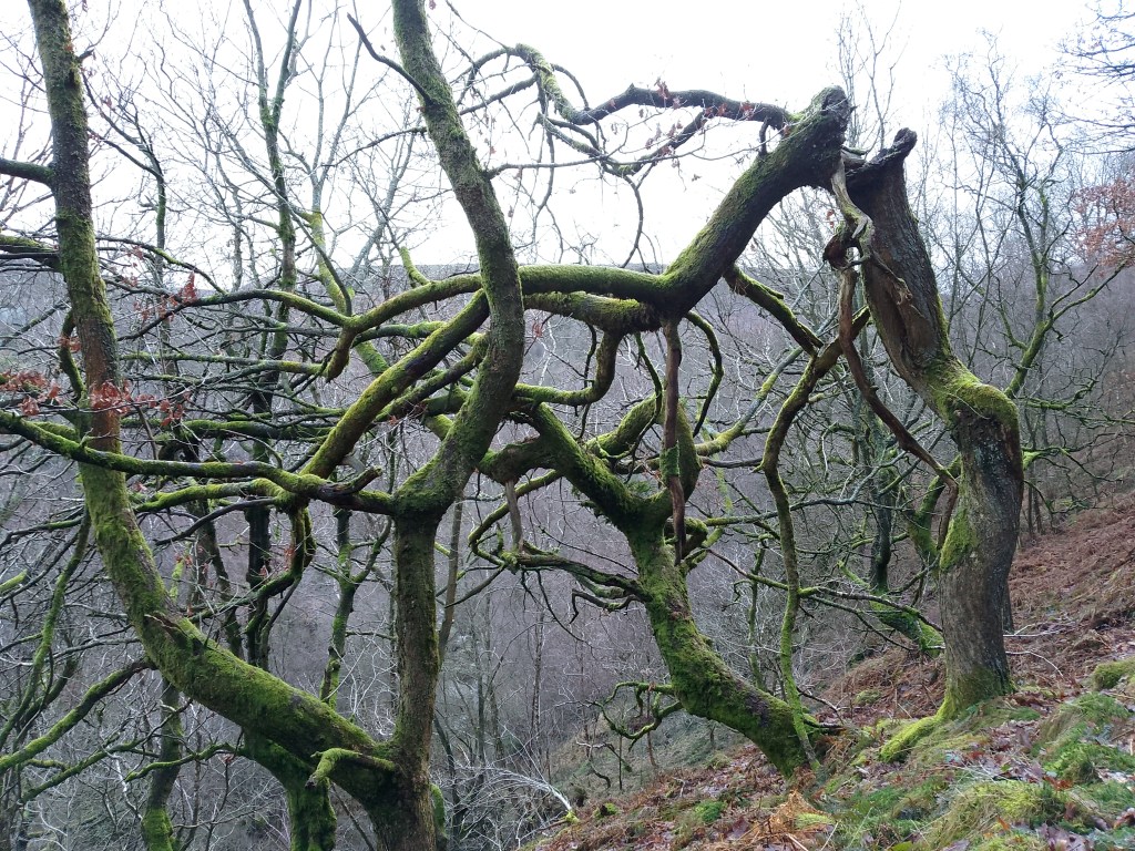 The photo is of knarled oak trees that cover a river source near the Woodhead Pass area of Dark Peak, a river that eventually goes on to help form the infamous river Mersey.