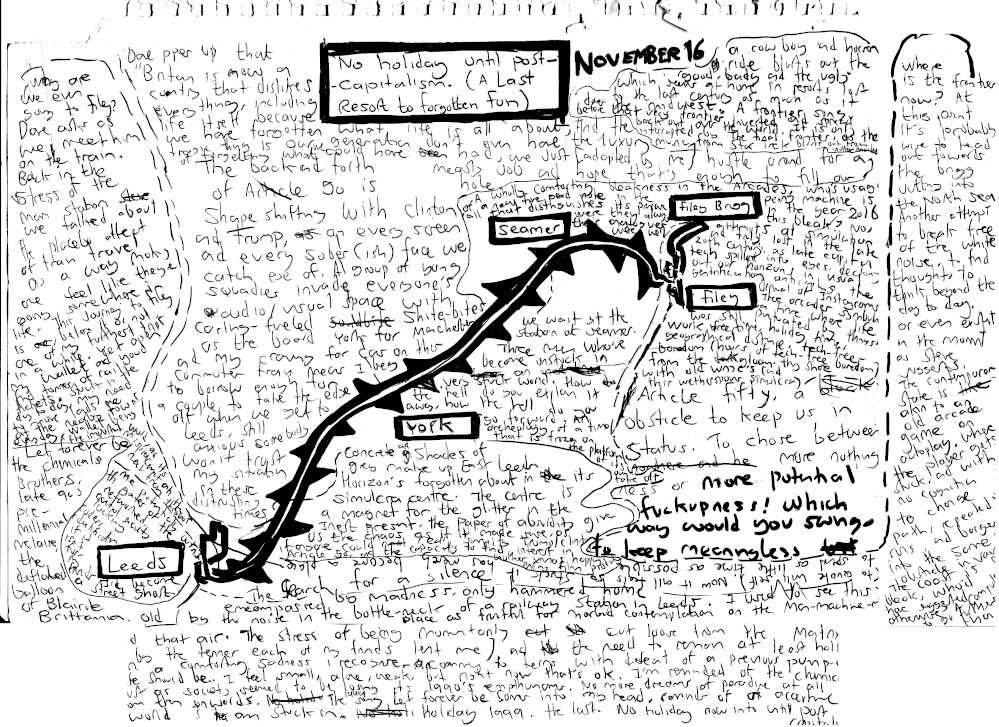 We’re relieved to get out of bottleneck of the north (Leeds station) as we join the now mostly emptied train for our journey to the North Sea coastline on this cold November morning. This station is making us both uneasy. This cold, hollow sort of self-reflection is filled horribly by the noise of this metal-on-metal place. At one point, when a certain sort of examination of life didn’t seem so paralysed by painful introspection, I had a mutual agreement with this place: I’d have to feel stressed and drained – but it would supply me a fresh mine of morbid fascination of the ‘man-machine-matrix’ (Will Self) for artistic purposes. But now that things just feel so stuck it just aggravates a searching for silence amidst the madness.