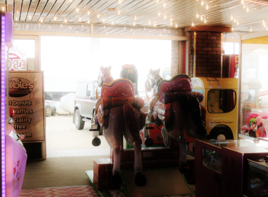 Suddenly a cheap quality recording of ‘The Good, The Bad and The Ugly’ theme rings out from a Wild West ride for young children. A song that evokes a frontier is lost to the last century. That very frontier inverted itself and spread back over the world a long time back now. Like childhood memories of holidays, it all seems like a thousand years ago. Suddenly a coin machine blurts out the Star Trek theme tune. The Final Frontier. The horses of this machine face the exit – they look to be galloping into a void.