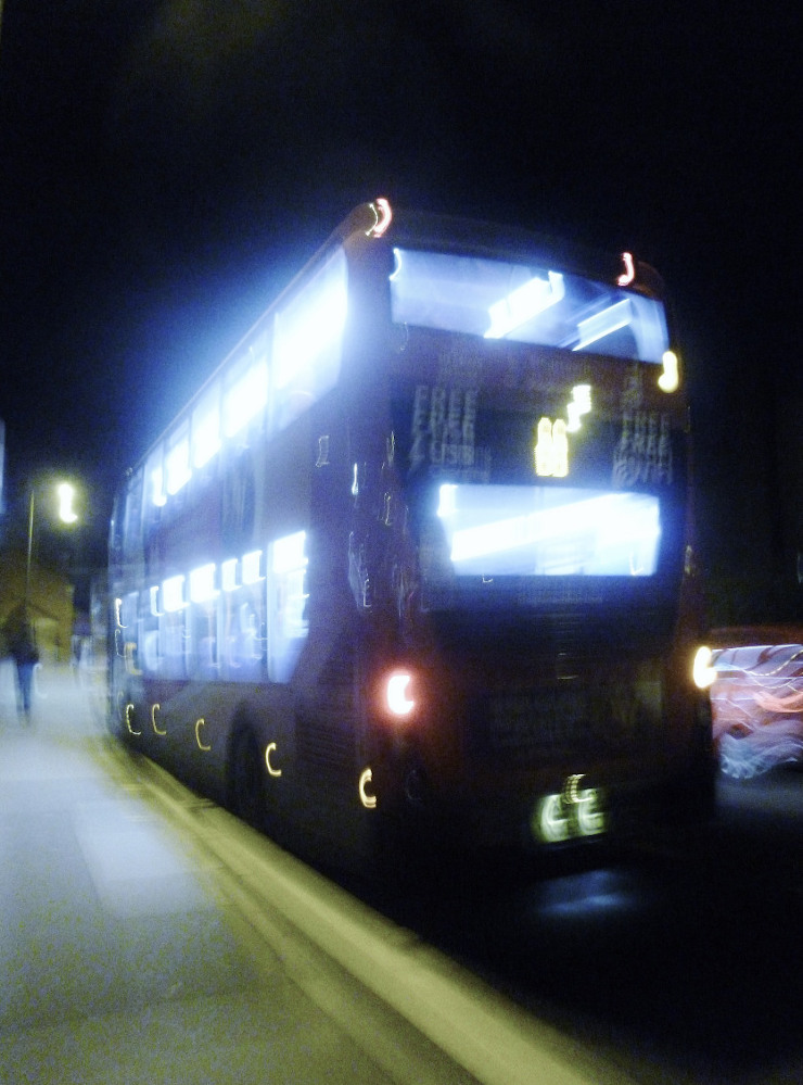 I pass the No 66 Elsecar Stagecoach bus, promoting ‘relaxation’ with its new onboard Wifi – the warm glow of The Feed as the nights draw in. I initially think of how being connected in every space imaginable isn’t relaxing at all. But I think again: maybe the anxiety is more in the gaps between the points of connection? The urge have unending stimulation. Perhaps it’s turning buses into the quiet, solitary modes of transportation that cars have always been, rather than the overspill of frustration borne from class injuries and alienation that they always used to be. Less aggro, less social anxiety. But more loneliness.
